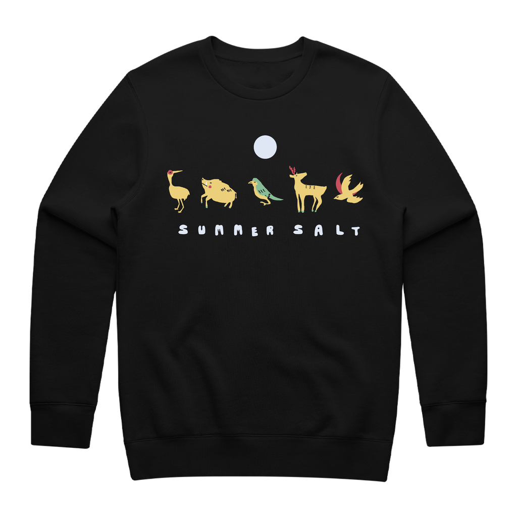 Official Summer Salt Merchandise. Screen printed front on a black 80/20 cotton/polyester blend fleece with 100% cotton 20 singles face yarn crewneck sweatshirt with a classic fit.