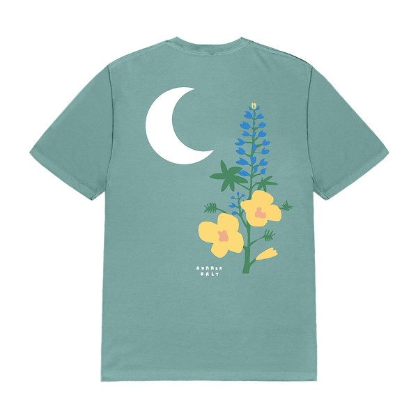 Official Summer Salt Merchandise. Screen printed front and back on a seafoam 100% Cotton T-Shirt with a relaxed fit.